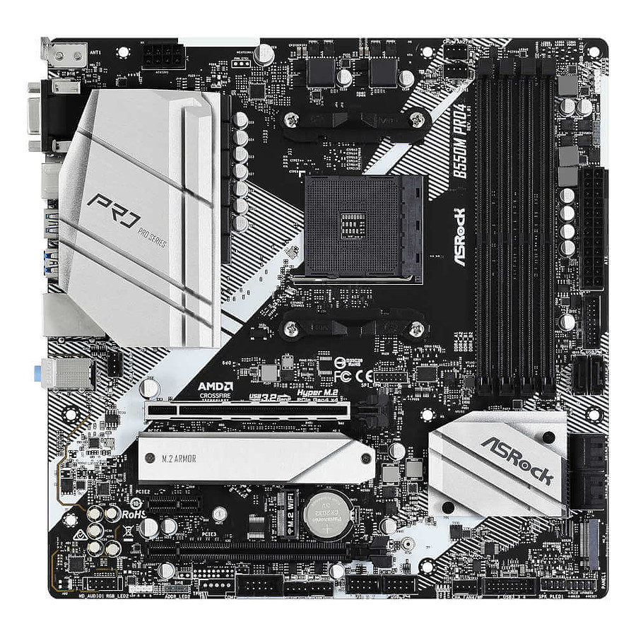 AMD B550 – Socket AM4 – Micro ATX – Matisse – Compatible processeurs AMD 3ème générationConçue pour accompagner les processeurs AMD Ryzen 3000 et 5000, la carte mère ASRock B550M Pro4 sur socket AM4 au format micro ATX est l’une des premières carte à prendre en charge la technologie PCIe 4.0 pour une bande passante doublée par rapport au 3.0, ainsi qu’une connectique plus fournie. Ce modèle repose sur une gamme complète de matériau et composants qui offrent une stabilité exemplaire et des performances haut de gamme. Une carte mère capable d’exécuter toutes les tâches qu’on lui confie !Référence: EL-DS5MXCM44