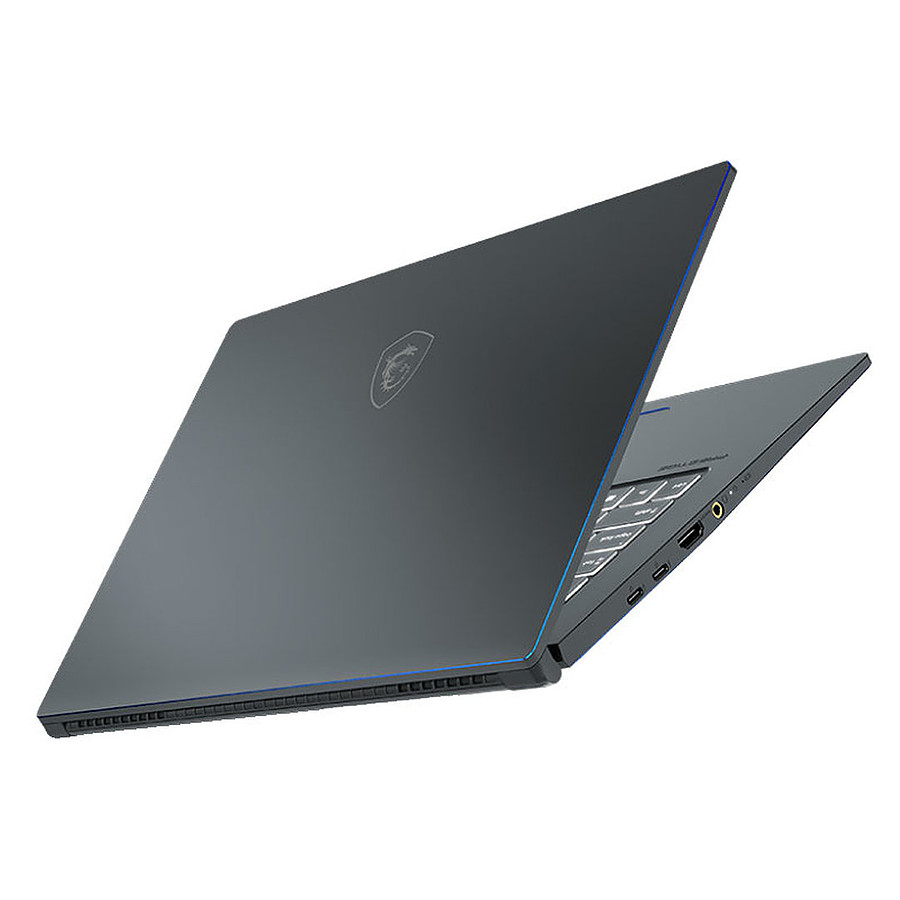 Reprennant les codes du PS63 dont il s’inspire, le Prestige 15 hérite d’un châssis aluminium réhaussé par une finition « diamond cut » bleutée que l’on retrouve tout autour du capôt et du trackpad. Cette conception métallique, en plus de le rendre extrêmement robuste, lui permet d’afficher des mensurations idéales pour votre mobilité. En effet, avec une épaisseur de 1,59 cm et un poids de 1,6 kg, vous pourrez l’emmener partout sans difficulté ! On notera par ailleurs ses charnières qui permettent de légèrement surélever le clavier à un angle de 5°, vous donnant ainsi une position parfaite pour une frappe agréable